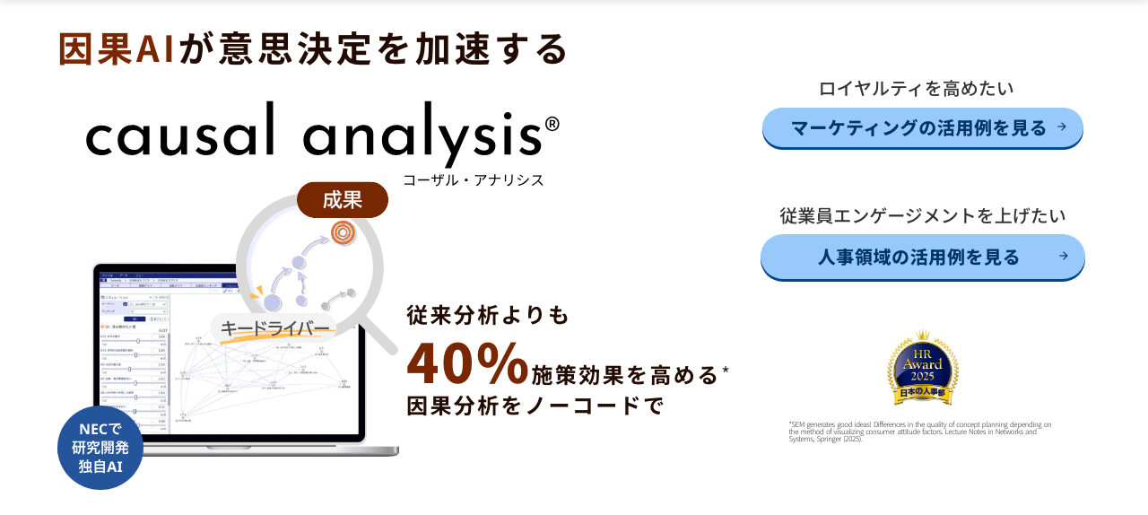 独自の因果 AI により効果的な施策につながる真因を特定し、マーケティングや人的資本経営において科学的な意思決定を支援。数多くの顧客から「まさに求めていたもの」と評価されている。
