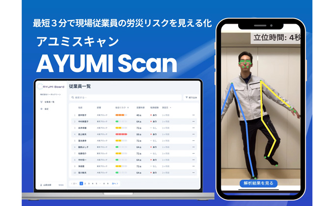 - AYUMI BIONICSは、心身機能データを活用した安全管理システムを提供しています。独自開発したAYUMI Scanは中高年従業員の労災リスクを測定し、データ解析と職場改善までサポートします。