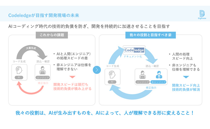 伊藤 :DigKnow株式会社は、ITエンジニアの非生産的な作業やナレッジの属人化などを解消するため、技術ドキュメント自動生成AIサービス「Codeledge」を開発しています。生成AIを活用することで、最新のドキュメントが常に伴走している開発現場を「あたりまえ」とすることが目標です。ITシステムやソースコードに埋もれている知識を掘り起こすことで、新たなイノベーションが巻き起こる社会の構築を目指し、「Dig up Knowledge for INNOVATION」というミッションを実現していきます。