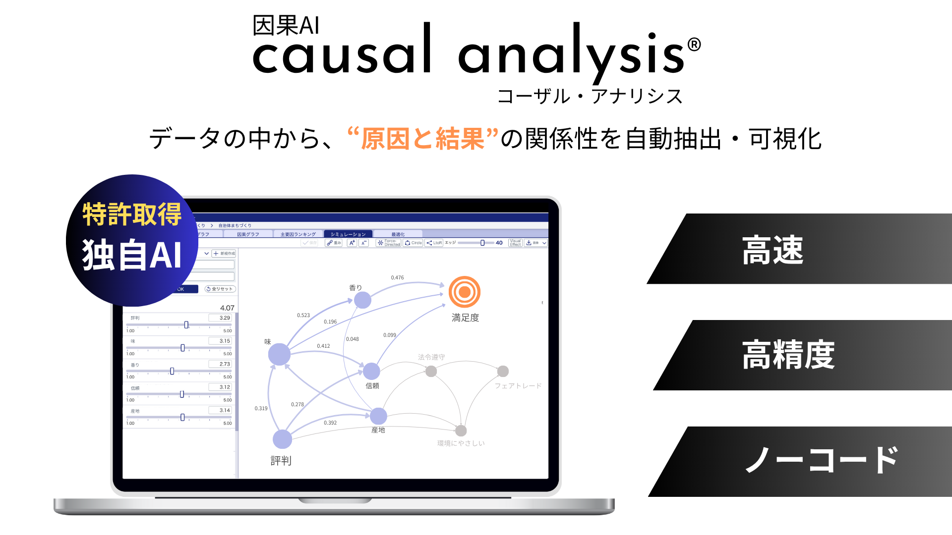 めぇ〜ちゃん- 因果AI「causal analysis®︎」は、データの中から“原因と結果”の関係を自動で見つけ出し、効果的な施策の立案と根拠ある意思決定を支援する分析ツールです。