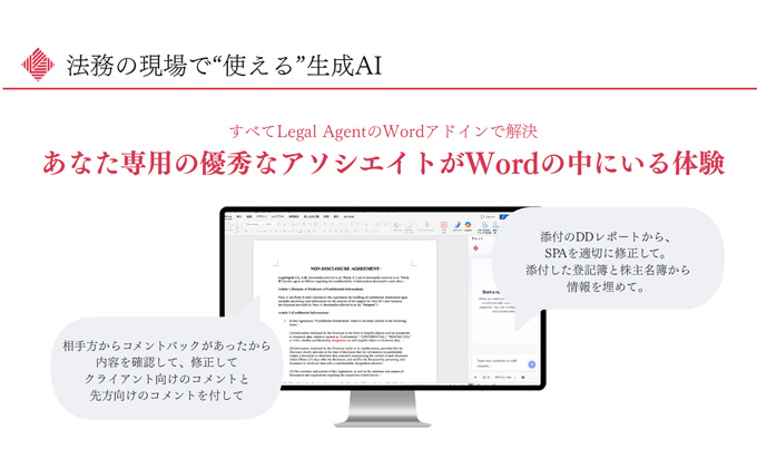 朝戸 :Legal Agentは、AI-BPOと、法務特化のAI-Agentを提供しています。主力プロダクトの「Legal Agent」は、Word上で契約書や各種法務書面を直接修正し、優秀なアソシエイト弁護士のように変更履歴やコメントの付与まで行える法務特化のAI Agentです。