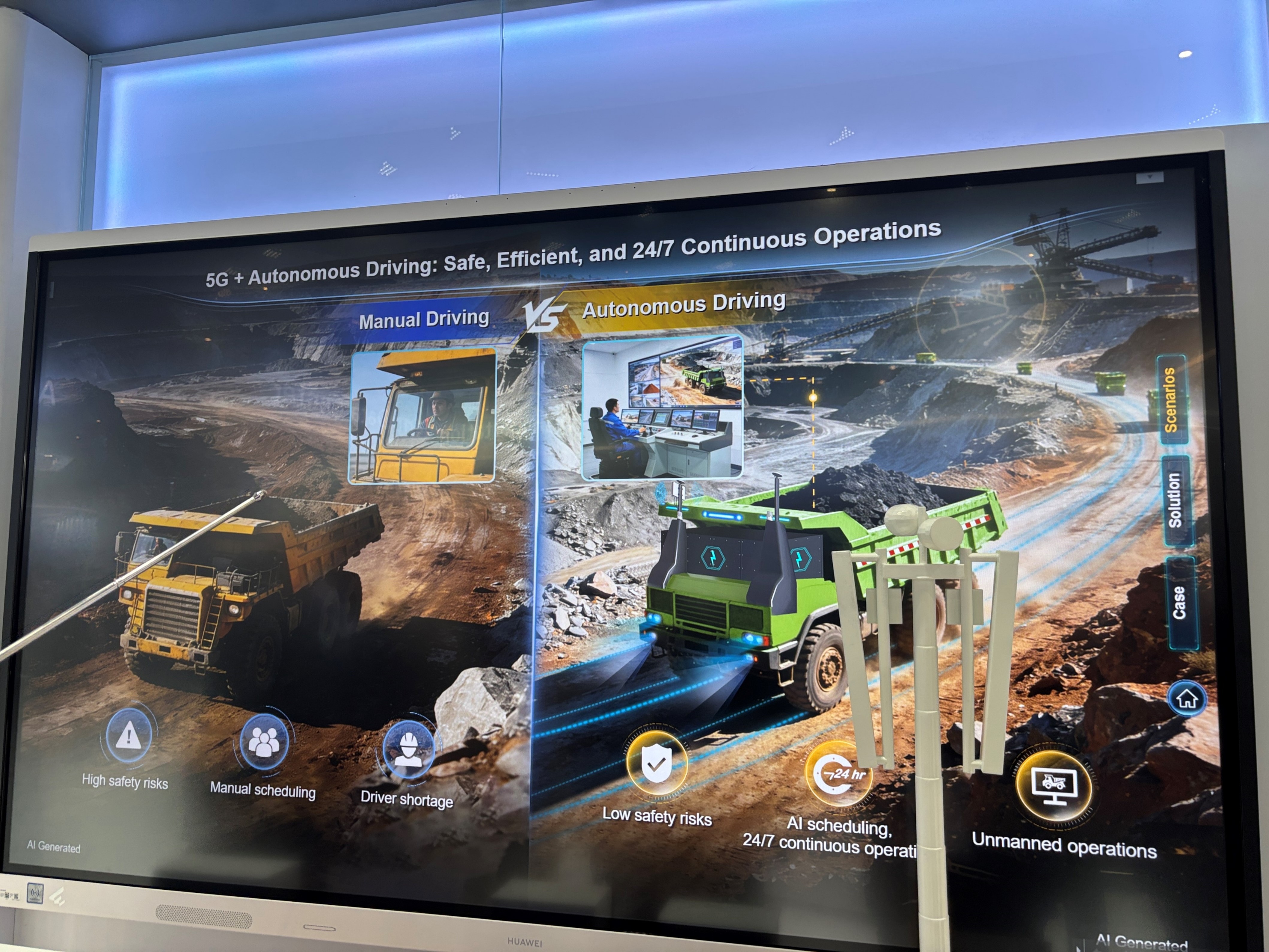 中国のICT企業Huaweiのブースでは、5G-Advancedとクラウドを活用し、モンゴルの鉱山で100台規模の自動運転ダンプを24時間365日稼働させている事例が紹介されていた。