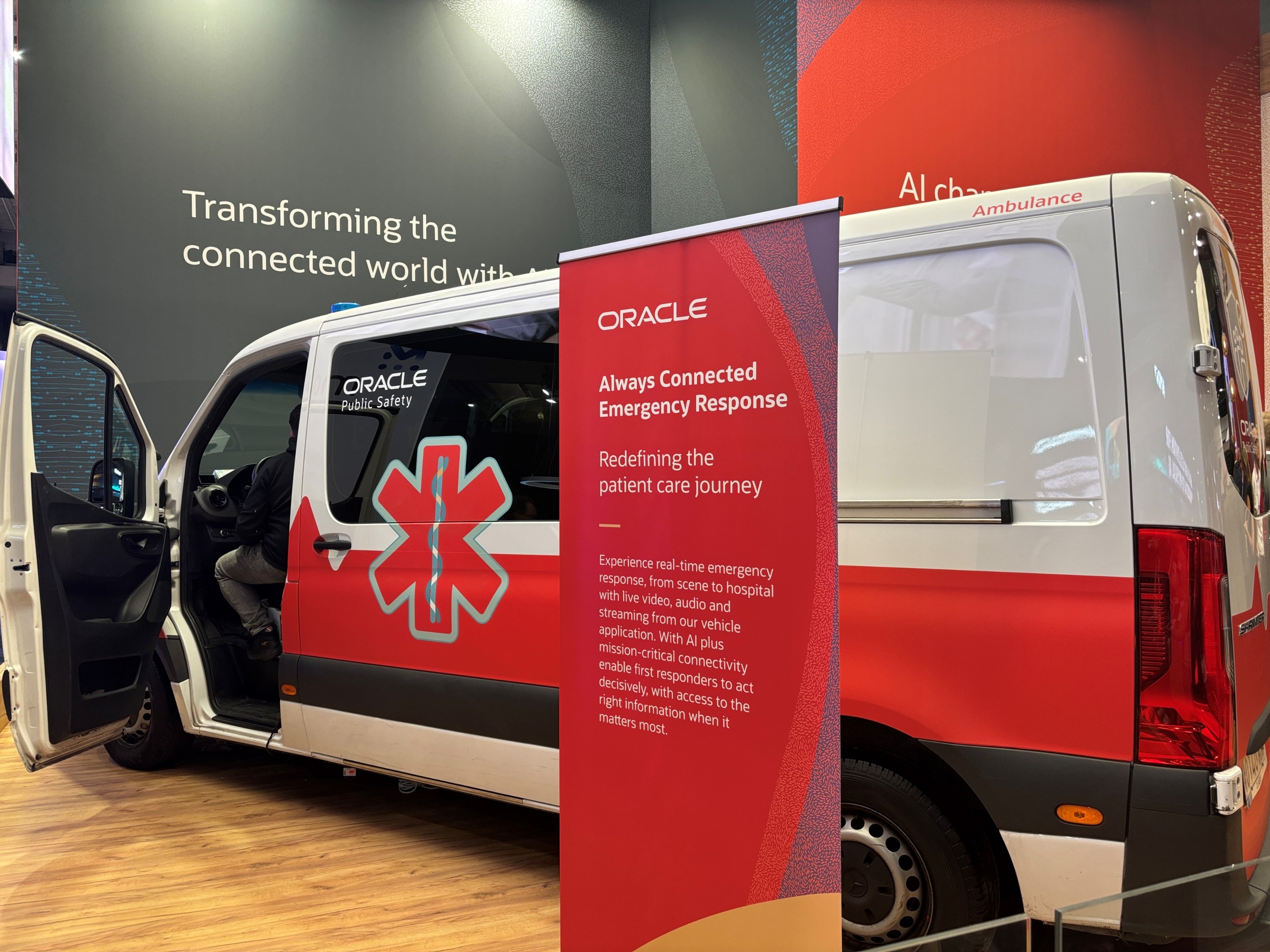アメリカのソフトウェア企業ORACLEは、救急車内の生体・映像データをAIとクラウドでリアルタイムに病院と共有する「コネクテッド救急車」を展示。これにより、病院側は患者の到着前から最適な治療準備を始めることが可能。